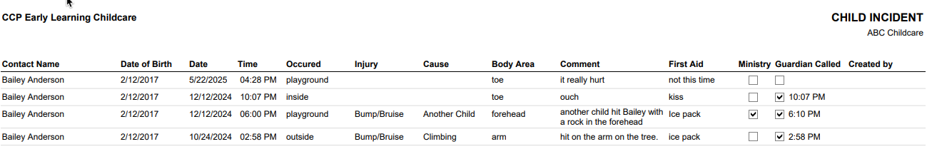 The Child Incident Report displays the information that was entered into the system under the child’s account > Incident tab.