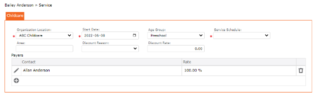 New fields will be added to your screen based on the types of services offered and area where the services are offered. This will include building recurring schedules and the frequency of these. Once the fields are completed and the services are added to the child, the user may add the Payers.